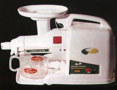 | Green Power Gold Juice Extractor | You are not What You Eat, But What you Absorb. The rate of absorption of juice has never been considered a factor in comparing juicers. With the introduction of Green Power's magnetic Twin Gear press, this has now changed. Experiments conducted by the Green Power Co. Research and Development Dept. show the rate of absorption of green juice using dual gear extraction is up to five times greater than using centrifugal extraction. |