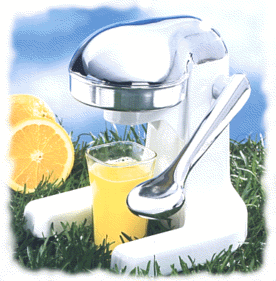 | OJ Home Juicer | There's just no substitute for a properly squeezed orange in the morning. So delicate and refreshing. The finest hotels use mechanical juicers of this type for their most discriminating guests. This is the largest selling juicer of its kind. It's a beautiful little all-metal piece in baked enamel and polished chrome; it even won the Frankfurt Fair Award for its design. Uses no electricity and produces no non-recyclable waste as do frozen juices. |